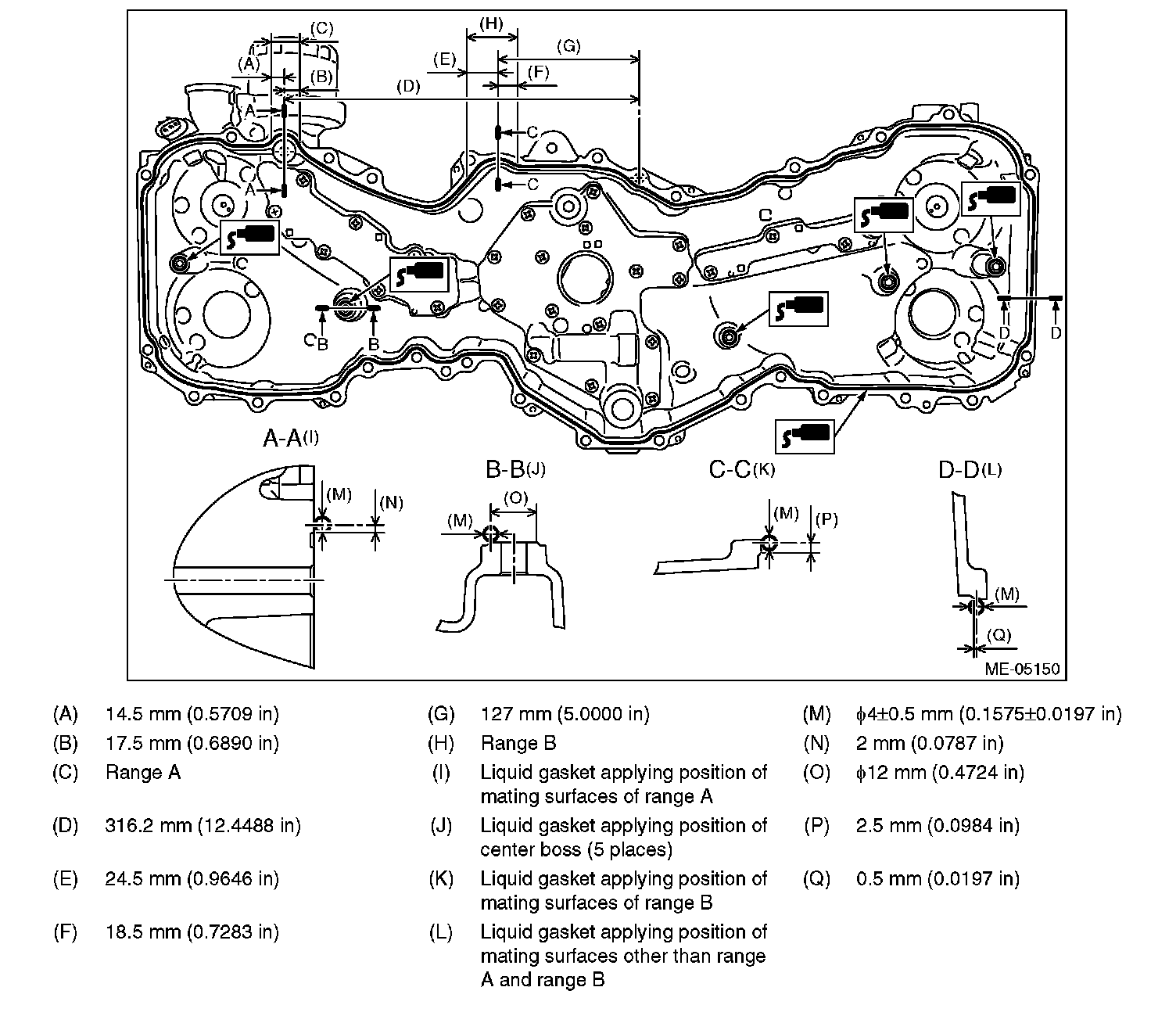 3) Apply liquid gasket to the chain cover mating surface and center boss (5 places) as shown in the figure.