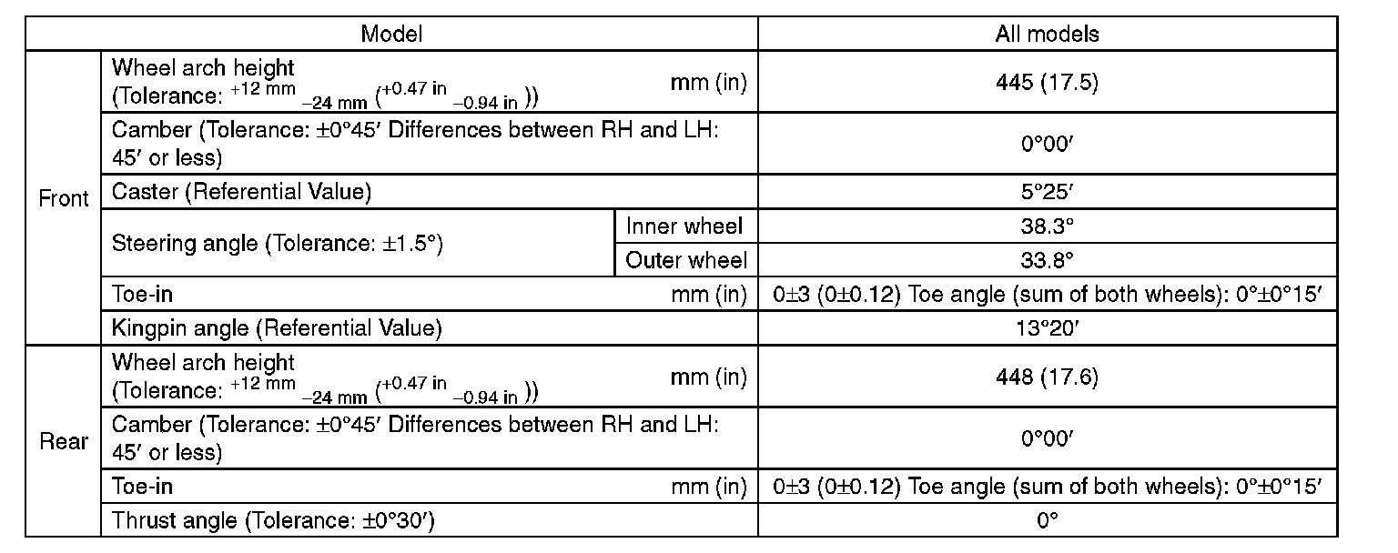 ^ Other items indicated in the specifications is not equipped with adjustment mechanisms. If other items exceed specifications, check the suspension parts and connections for deformation. If defective, replace with new parts.