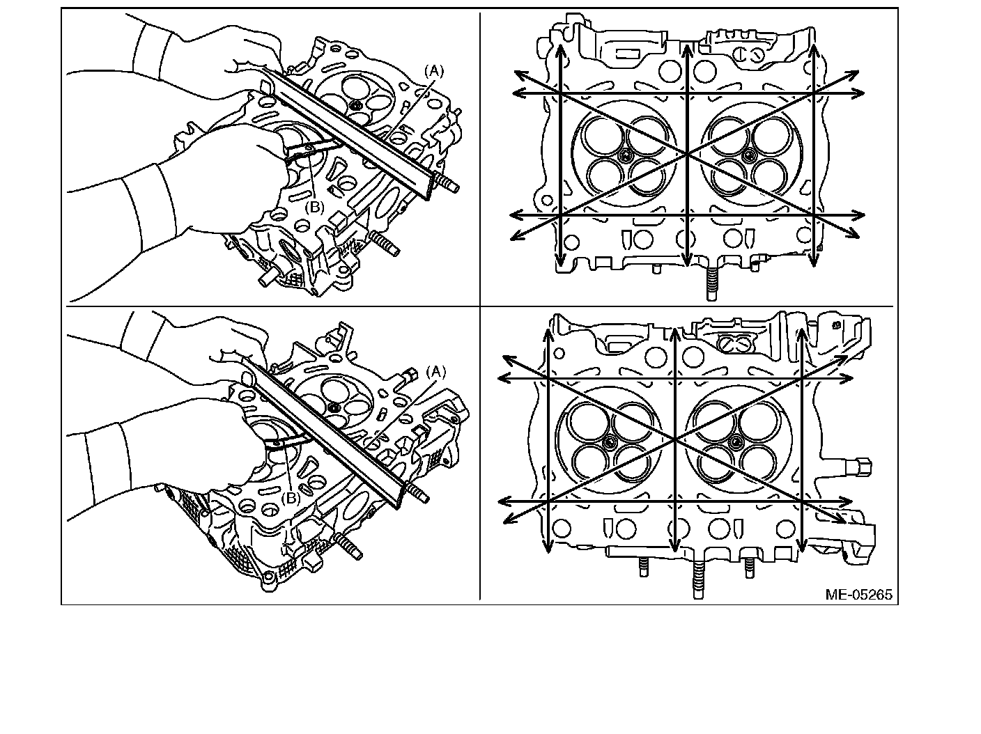 Check the warping of the cylinder head mating surface that mates with cylinder block using a straight edge (A) and thickness gauge (B) at the locations shown in the figure. If it exceeds the limit, correct the surface by grinding it with a surface grinder or replace the cylinder head. Measurement should be performed at a temperature of 20°C (68°F).