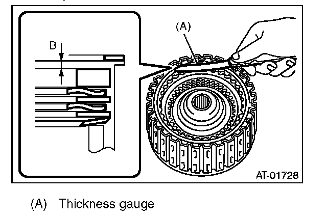 (9) Measure and record the clearance "B" between the retaining plate and snap ring. (Reverse clutch) At this time, do not press down the retaining plate.