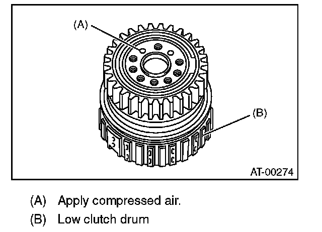 9) Install the one-way clutch inner race to the low clutch drum, and then apply compressed air to remove the low clutch piston.