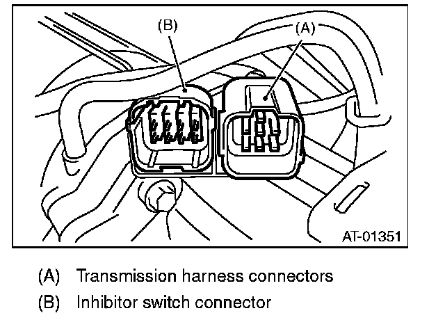 8) Insert the inhibitor switch connector and transmission harness connector onto the stay.