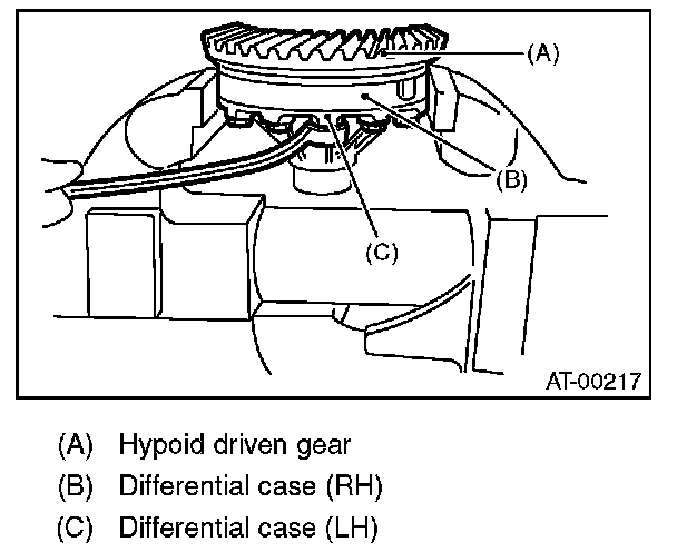 ^ Hold the differential case assembly by hand to avoid damaging the retainer mounting hole of the converter case.