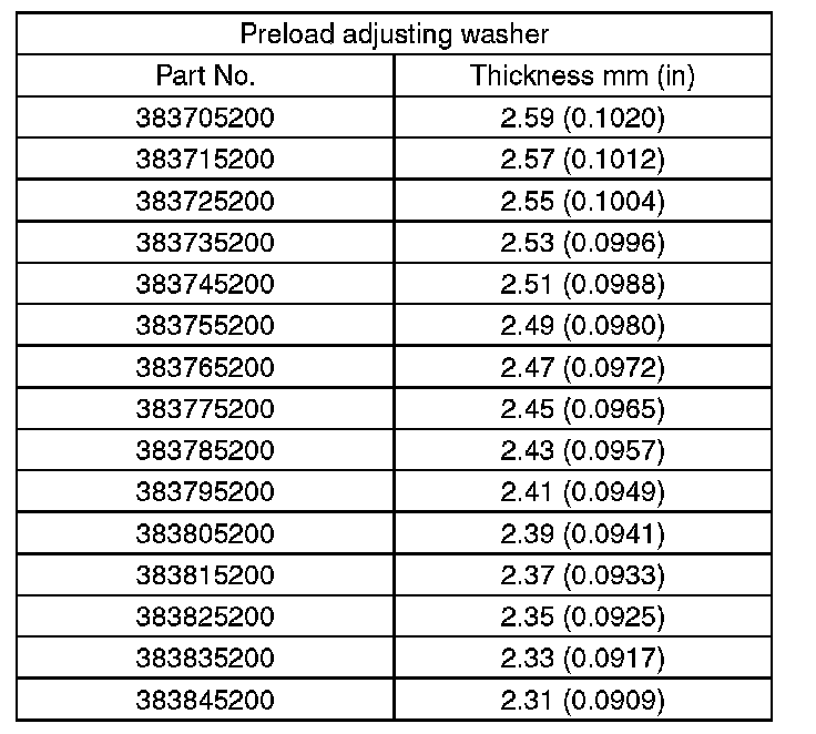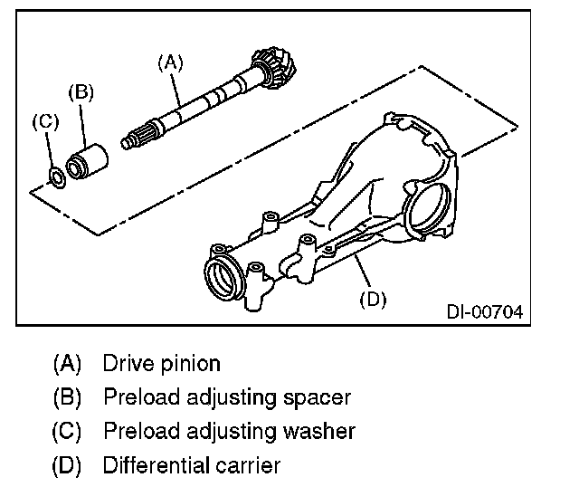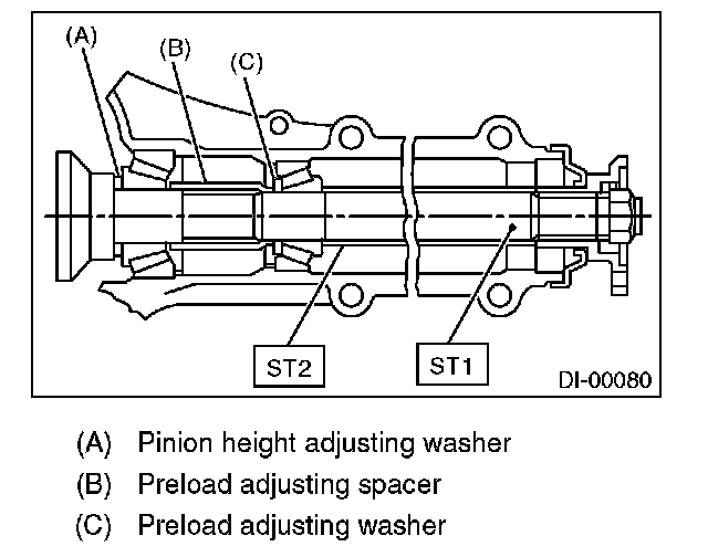 Adjust the bearing preload between front and rear bearings with preload adjusting spacer and washer. Pinion height adjusting washer is not affected by this adjustment. The adjustment must not be carried out with oil seal inserted.