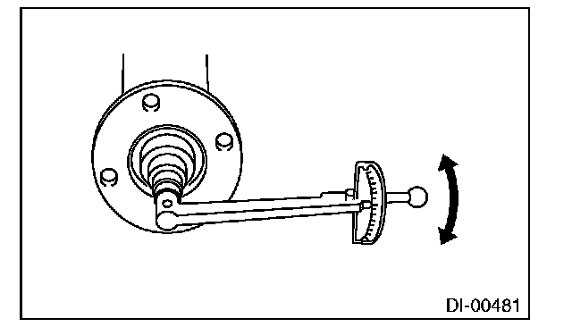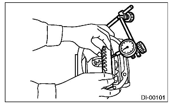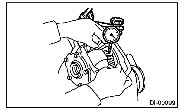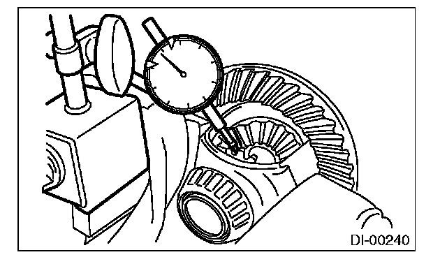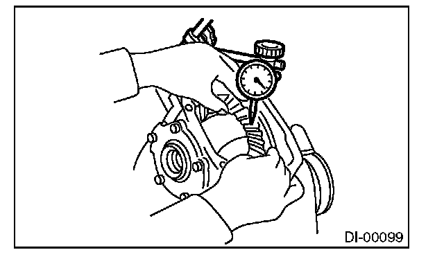 18) Check the runout on the back side of the hypoid driven gear, and make sure that the pinion and hypoid driven gears rotate smoothly. If the runout on the back side of the hypoid driven gear exceeds the specification, check for any foreign material between the hypoid driven gear and differential case, and for any deformation of the case or gear.