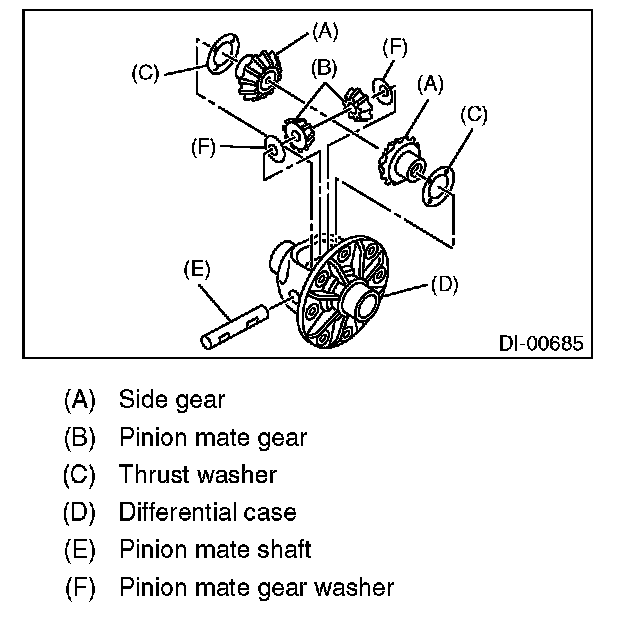 12) Draw out the pinion mate shaft, and remove pinion mate gears, pinion mate gear washers, side gears, and thrust washers.