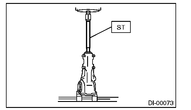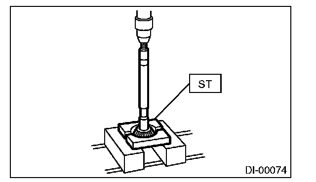 15) Press the end of drive pinion shaft by using the ST, and remove the drive pinion shaft, rear bearing cone, preload adjusting spacer and washer.