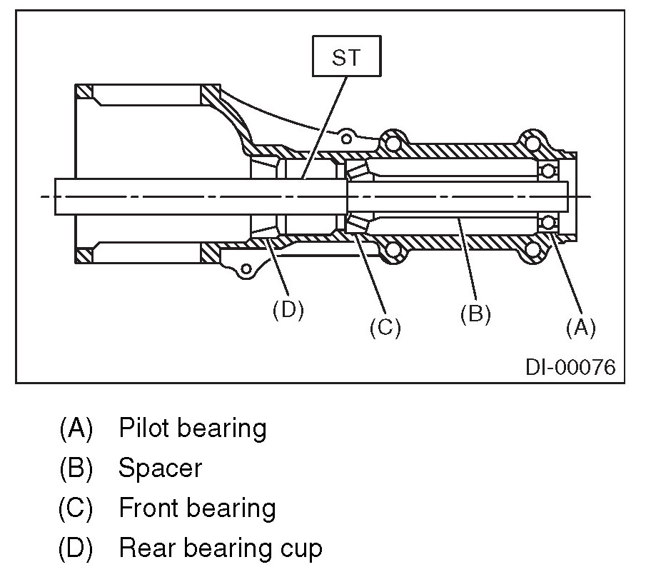 18) Remove the pilot bearing together with the front bearing cone and spacer using the ST.