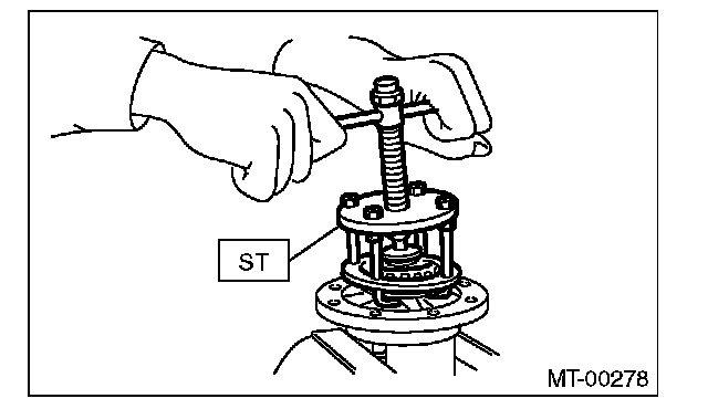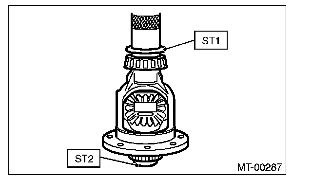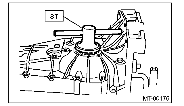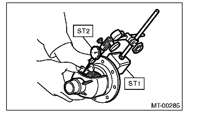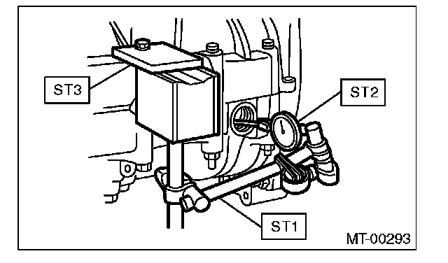 1) Set the ST1, ST2 and ST3. Insert the needle through transmission oil drain plug hole so that the needle comes in contact with the tooth surface on the right corner, and check the backlash.