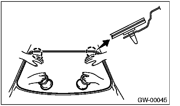 10. Using suction rubber cups, fit the locator pins into the body side, and attach the windshield glass.