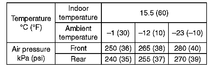 ^ When adjusting tire pressure indoors in winter, there is a big temperature difference between the indoor facilities and outside. Once the car is outside where the temperature is lower, the air pressure in the tires will drop, causing the tire pressure warning light to illuminate, even if the pressure in the tires was adjusted to standard values indoors. To avoid this, it is necessary to adjust the tire pressure to the high side in consideration of the difference in temperature between inside and outside according to the following table.