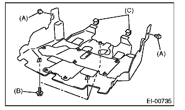 2. Remove clips (A), (C) in front fender and bolts (B), then remove the front under cover.