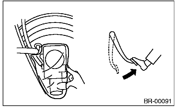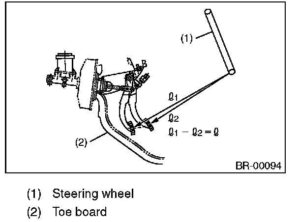 10) Check the pedal stroke. Run the engine at idle after warming up the engine, and depress the brake pedal with a force of 500 N (51 kgf, 112 lbf). Measure the distance between the brake pedal and steering wheel. Release the pedal, and measure the distance between pedal and steering wheel again.