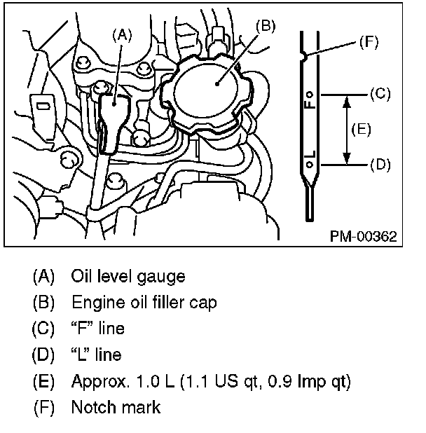 9) After stopping the engine, recheck the oil level. If necessary, add engine oil up to the "F" line on oil level gauge.