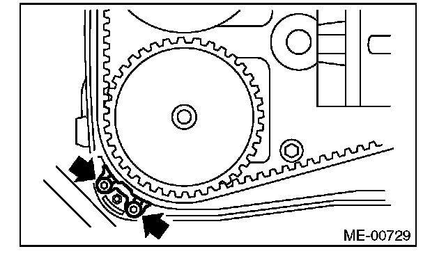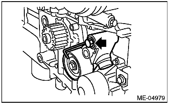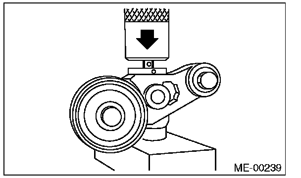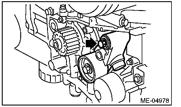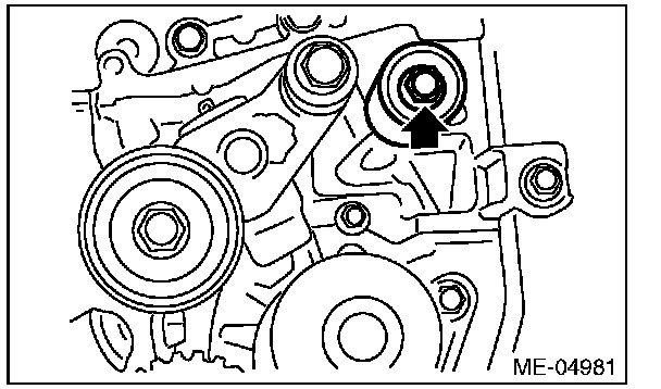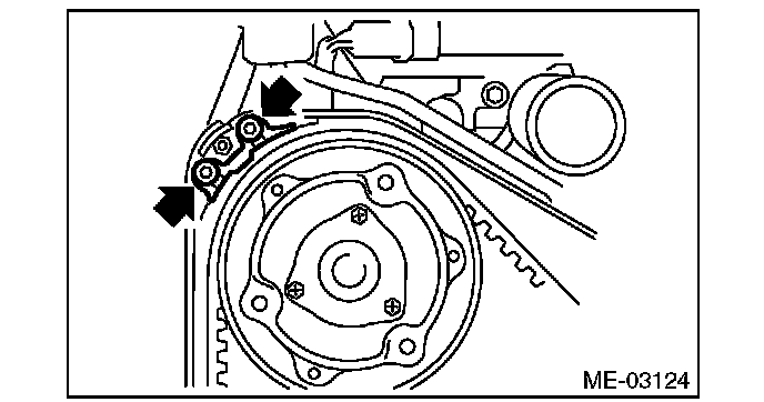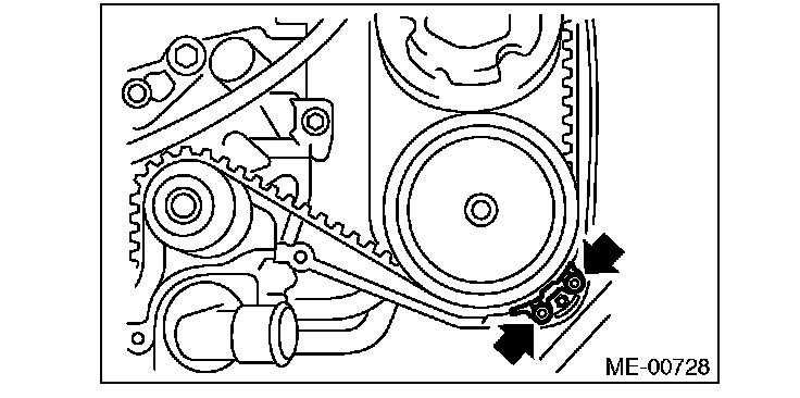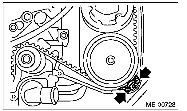 2) Check the belt tension pulley for smooth rotation. Replace the automatic belt tension adjuster assembly with a new part if abnormal noise or excessive play occurs.