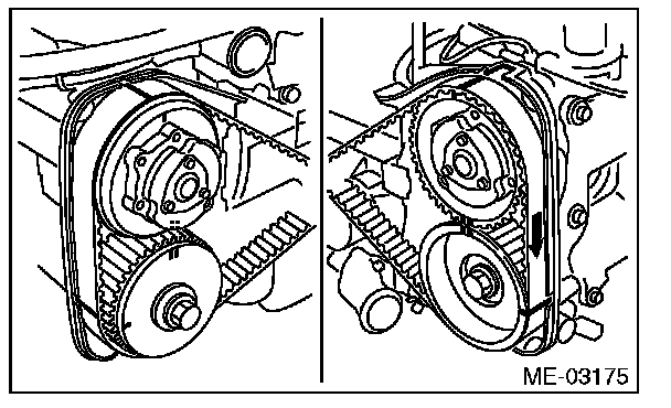 4) If the alignment mark or arrow mark (which indicates the direction of rotation) on timing belt fade away, put new marks before removing the timing belt as shown in procedures below.