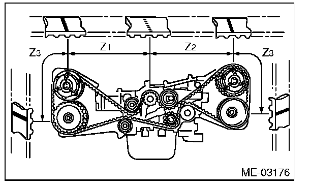 1) Check the timing belt teeth for breaks, cracks or wear. If any fault is found, replace the timing belt.