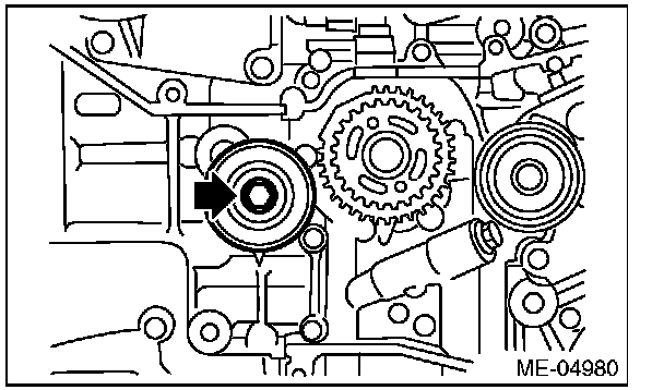 ^ Apply liquid gasket to the thread of the timing belt guide mounting bolt on the cam sprocket section. (when reusing bolts)
