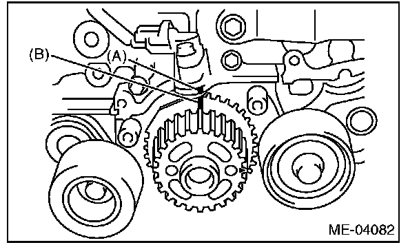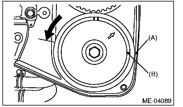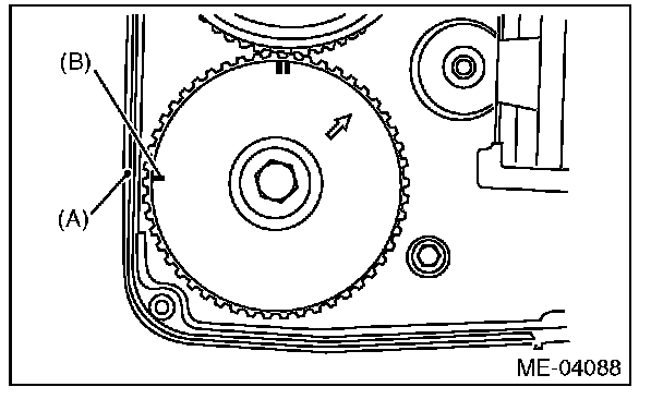 5) Align the single line mark (B) on exhaust cam sprocket LH with notch (A) on the timing belt cover by turning the sprocket counterclockwise (as viewed from front of engine).