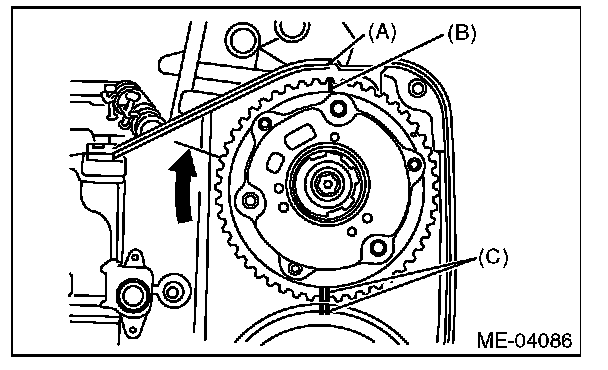 4) Align the single line mark (B) on the intake cam sprocket RH with notch (A) on the timing belt cover. Make sure that the double line marks (C) on intake cam sprocket and exhaust cam sprocket are aligned.