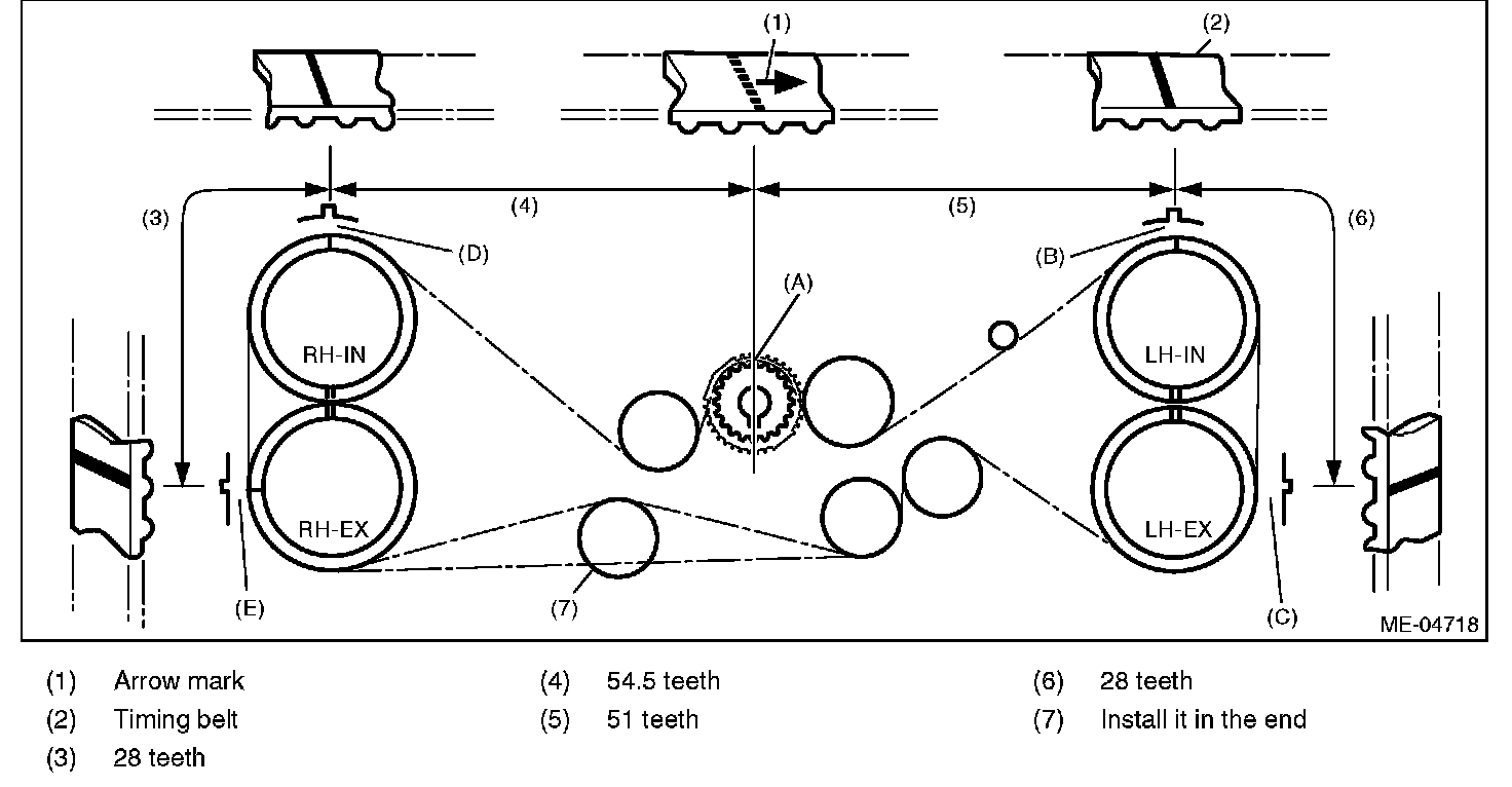 8) Align the alignment mark on the timing belt with marks on the sprockets in the alphabetical order shown in the figure. While aligning marks, position the timing belt properly, and install the timing belt.