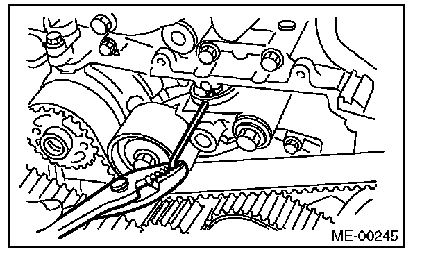10) After ensuring that the marks on the timing belt and sprockets are aligned, remove the stopper pin from tensioner adjuster.
