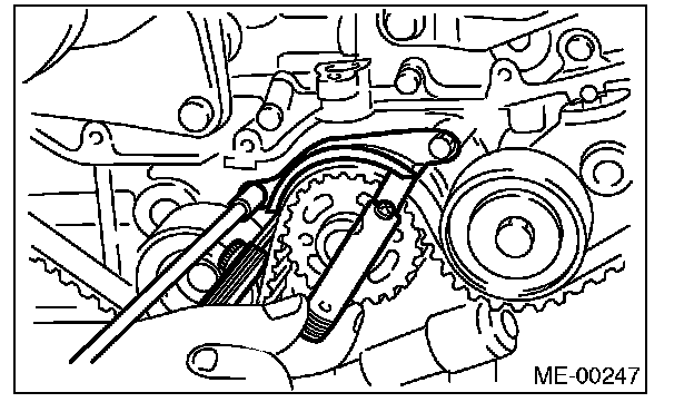 After the timing belt has been removed, never rotate the intake and exhaust sprocket. If the cam sprocket is rotated, the intake and exhaust valve heads strike together and valve stems are bent.