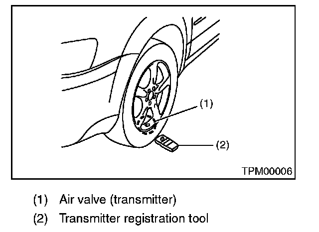 7) Contact the transmitter registration tool to the side wall area near the air valve on the front left tire, and press the switch. The transmitter ID is sent to the TPMS & keyless entry control module. (At this time, the tire pressure warning light blinks to confirm that the registration has started.)