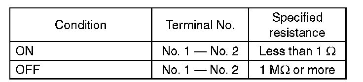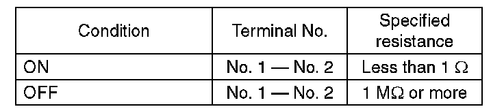 (2) Measure the resistance between terminal 1 and 2 of the switch. If the resistance is not at the standard value, replace the switch