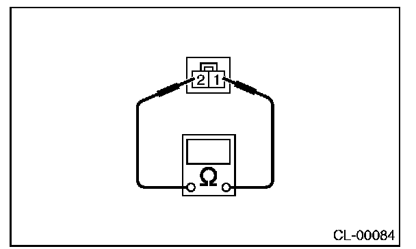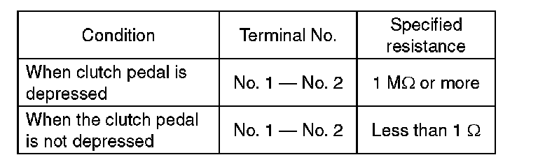 (2) Measure the resistance between terminal 1 and 2 of the switch. If the resistance is not within the specification, check the clutch stroke and installation condition, and check the clutch switch again.