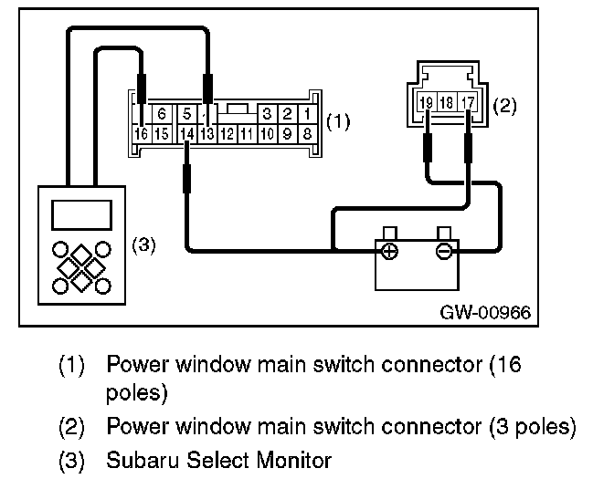 3. Connect the battery and the Subaru Select Monitor to the power window main switch connector.