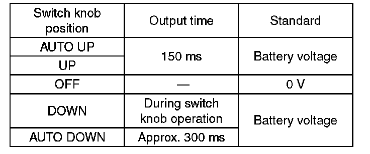 NOTE: Since output time during window UP operation is extremely short, it cannot be checked without using a measuring instrument such as oscilloscope. Output is constantly produced while the knob is operated for window DOWN operation.