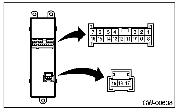 CAUTION: Never mix up the terminals when connecting the power window main switch connector and battery. If connected to a wrong terminal, the power window main switch may be damaged.