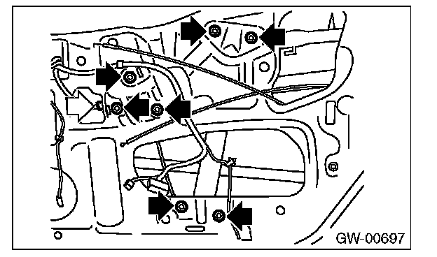 3. Remove the bolts, and then remove the front regulator and motor assembly.