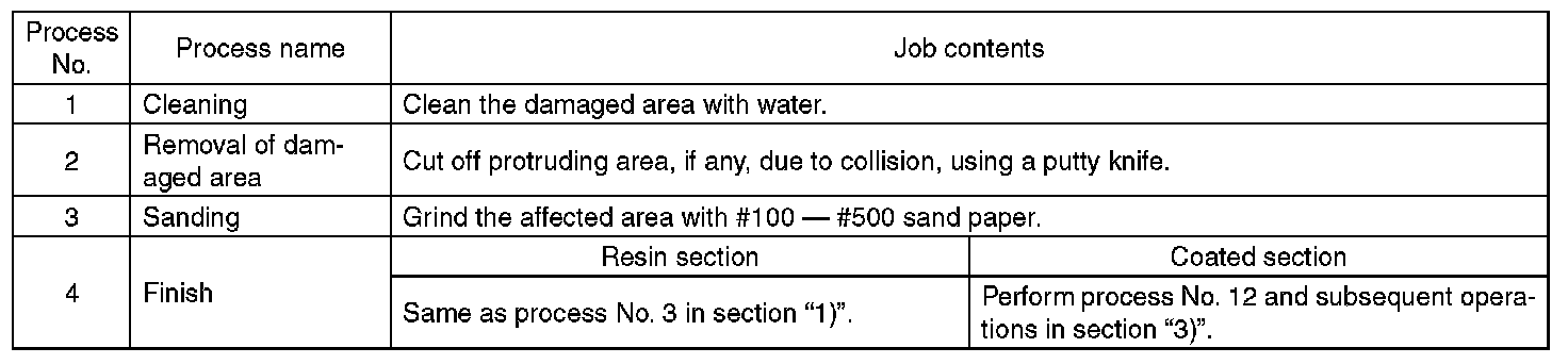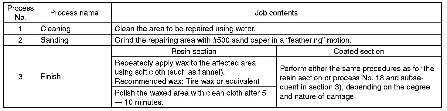 All PP bumpers are provided with a grained surface, and if the surface is damaged, it cannot normally be restored to its former condition. Damages limited to the shallow scratches that cause only a change in the luster of the base material or coating, can be almost fully restored. Before repairing a damaged area, explain this point to the customer and obtain an understanding about the matter.