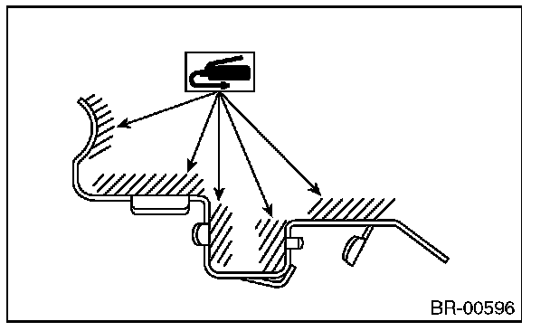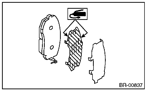 3) Apply a thin coat of Molykote AS880N (Part No. K0777YA010) or grease contained in the pad kit to both surfaces of the pad and inner shim.