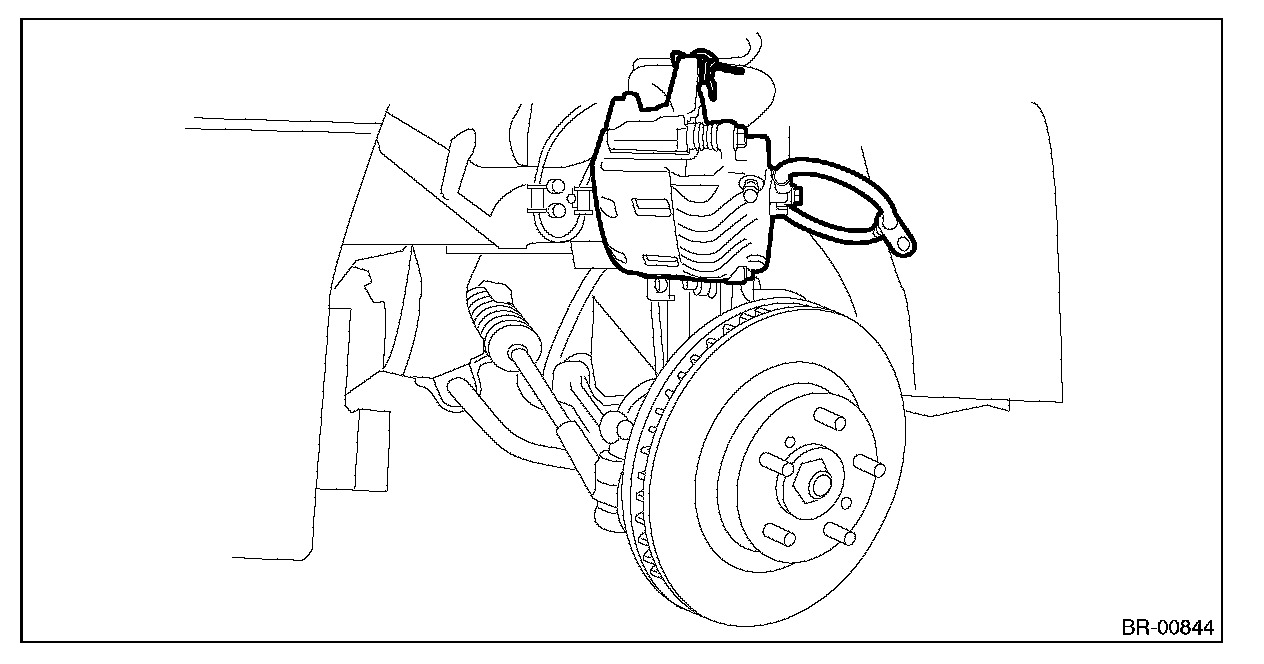 (3) Prepare wiring harnesses etc. to be discarded, and suspend the caliper body assembly from the shock absorber with the harnesses.