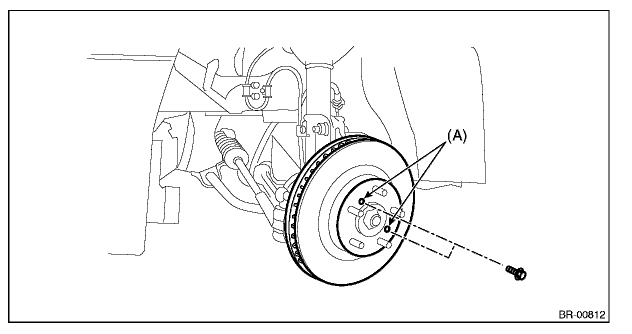 When the disc rotor is difficult to be removed from the front hub unit bearing, screw in 8 mm (0.31 in) bolt to the threaded part of the disc rotor (A), and remove the disc rotor.
