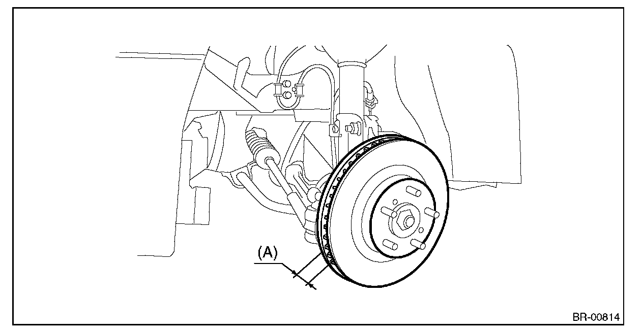 1) Set a micrometer 10 mm (0.39 in) inward from the disc rotor outer perimeter, and then measure the disc rotor thickness (A).