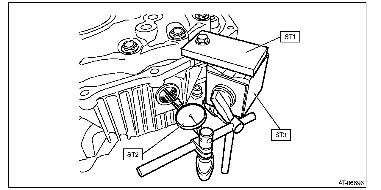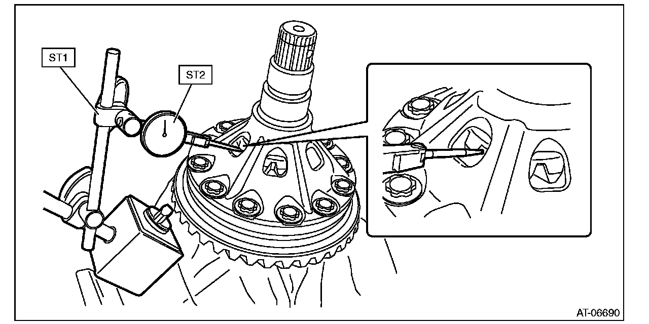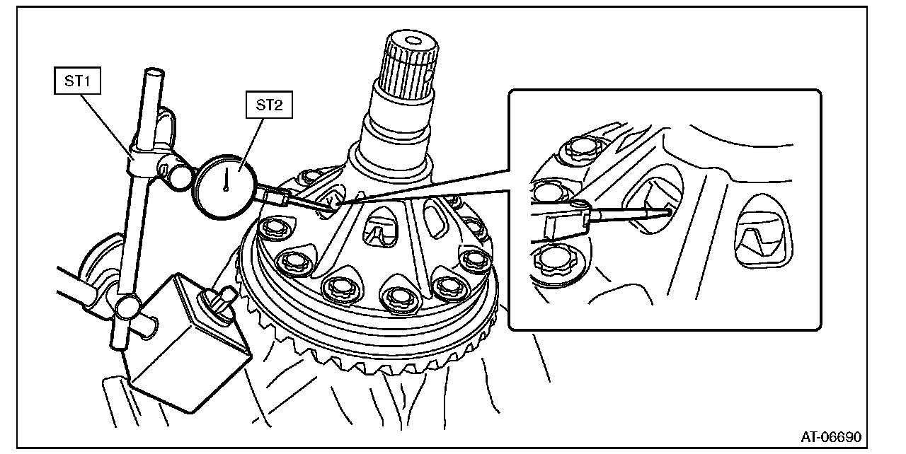 (2) Using ST1 and ST2, insert the ST2 through the window of differential case. Measure the backlash of the gear.