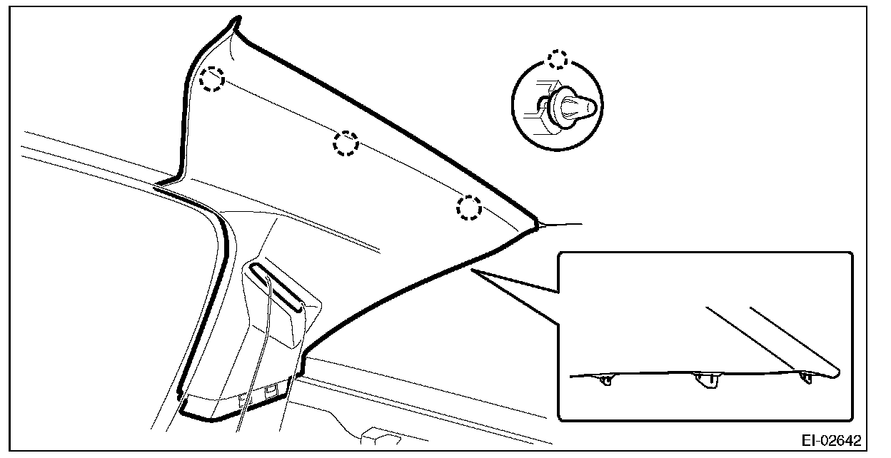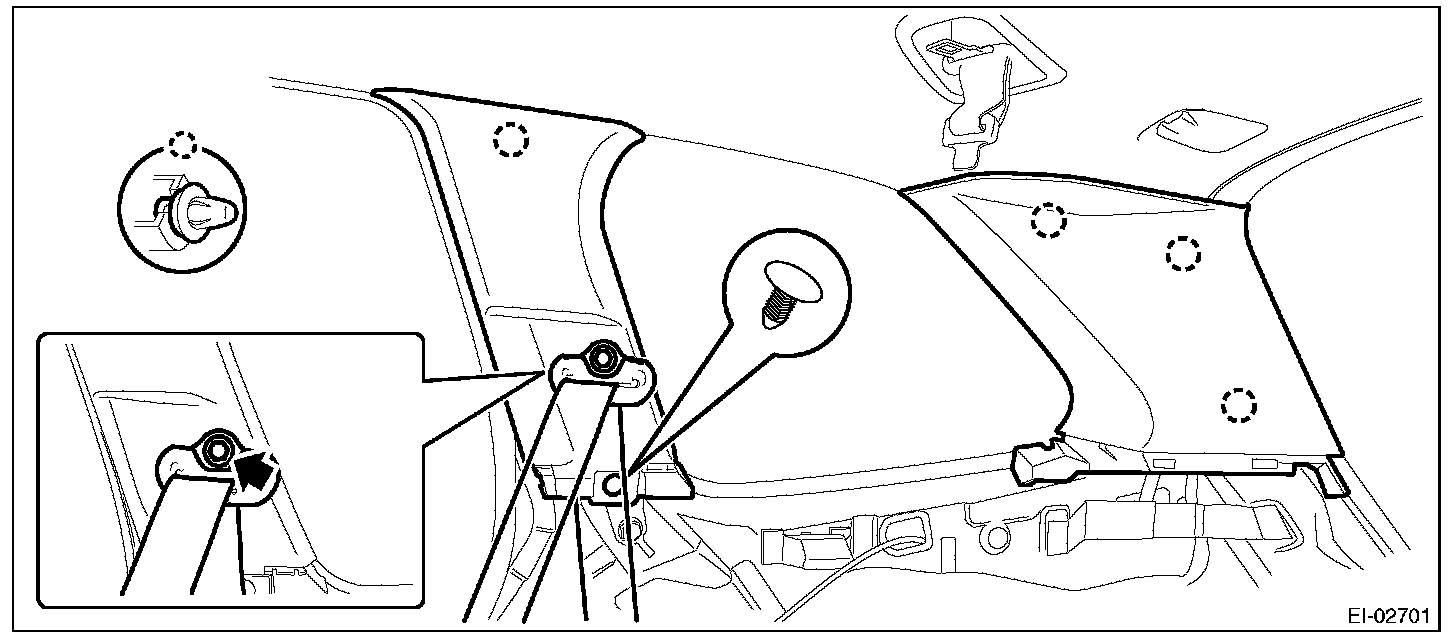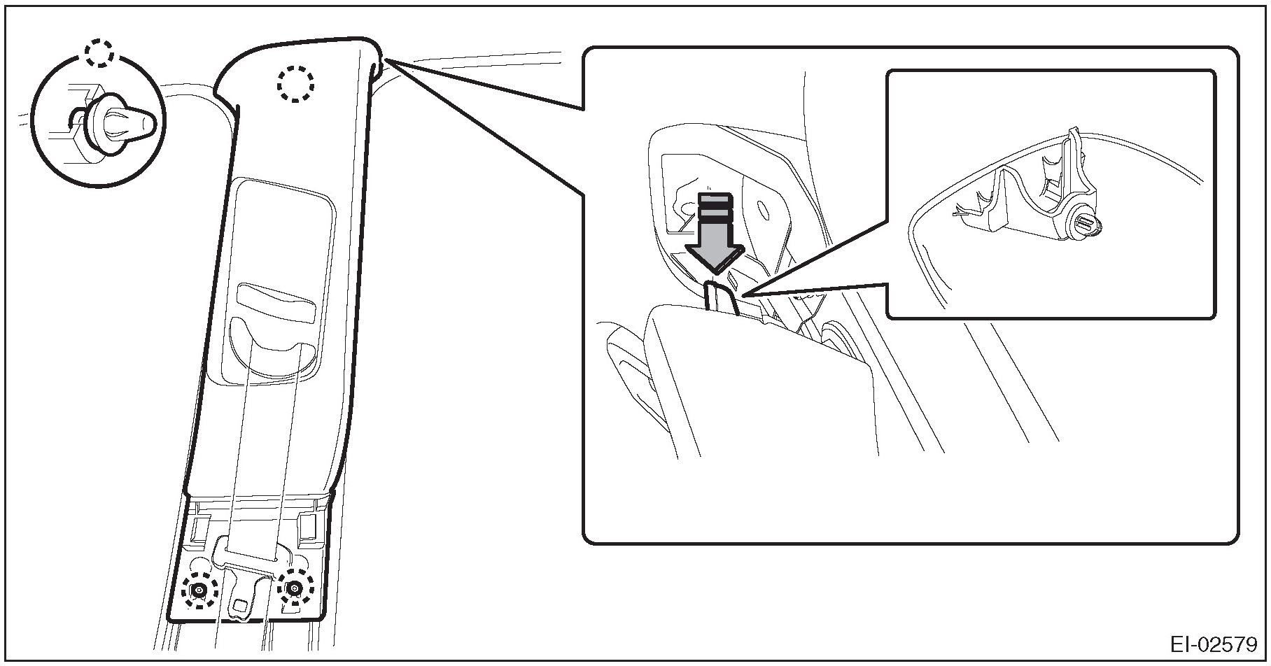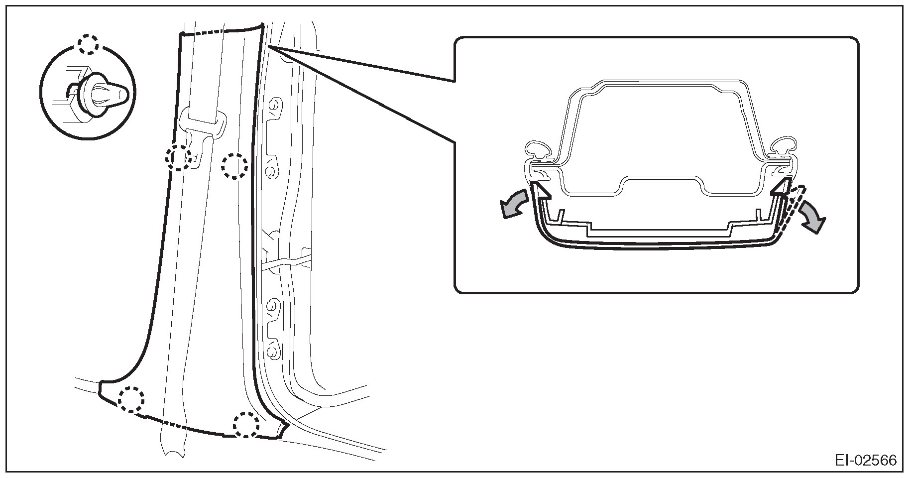 - Do not reuse the clips on the upper part of the center pillar trim. Once the clip is removed, its holding force is reduced. Be sure to replace it with a new clip.
