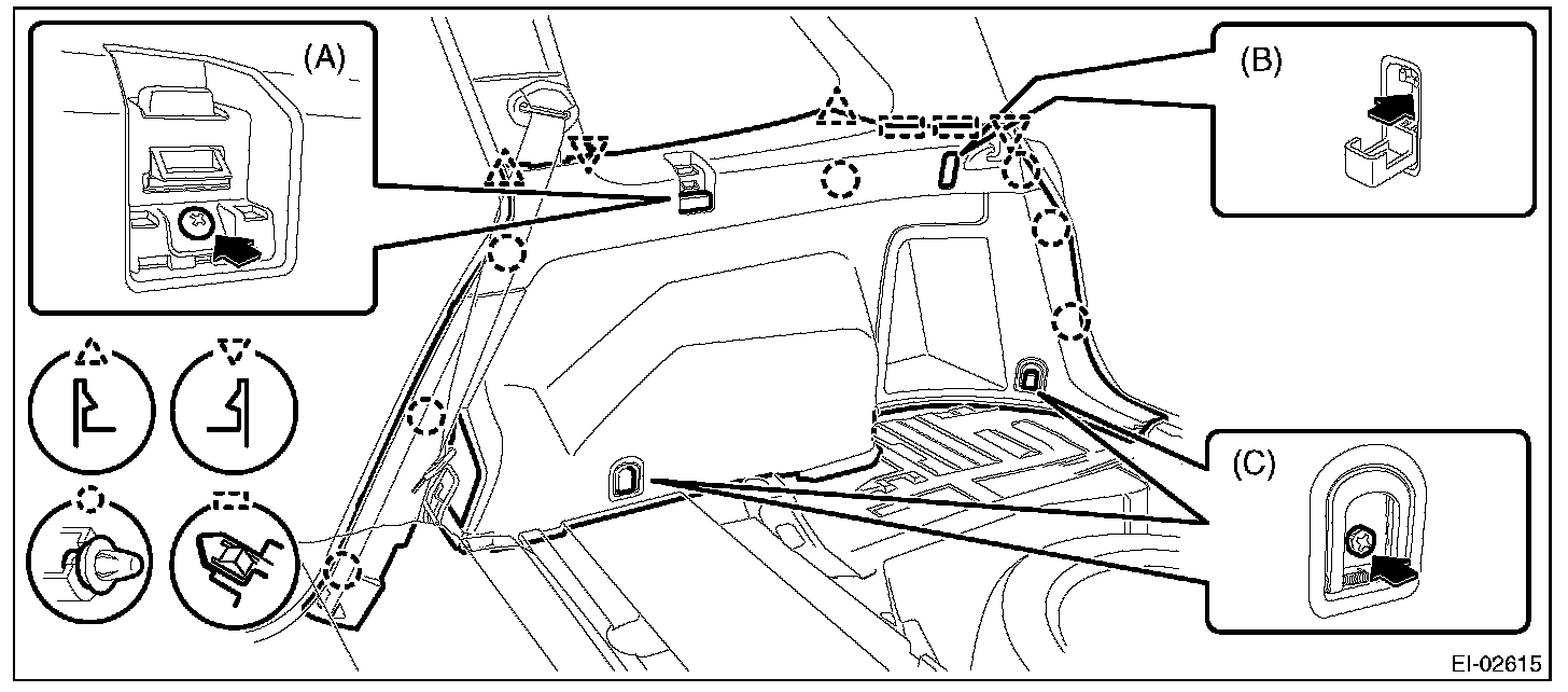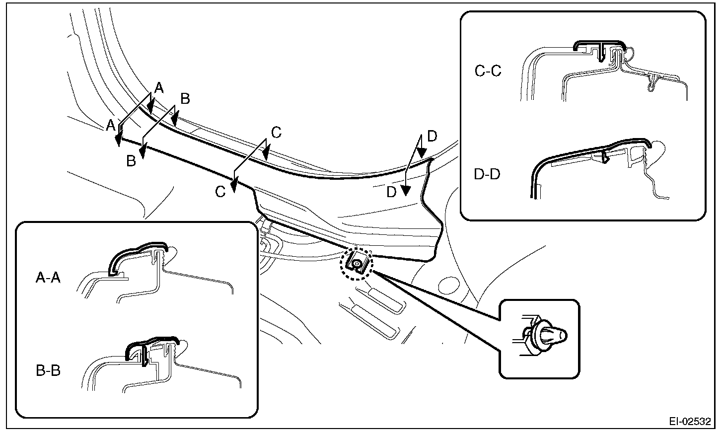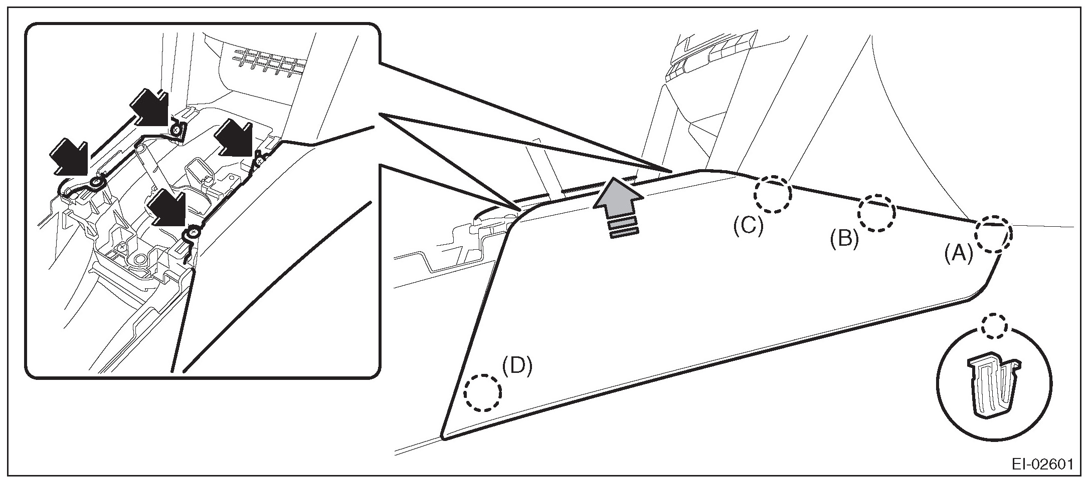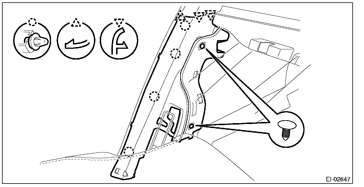 - Do not reuse the clips on the upper part of the center pillar trim. Once the clip is removed, its holding force is reduced. Be sure to replace it with a new clip.