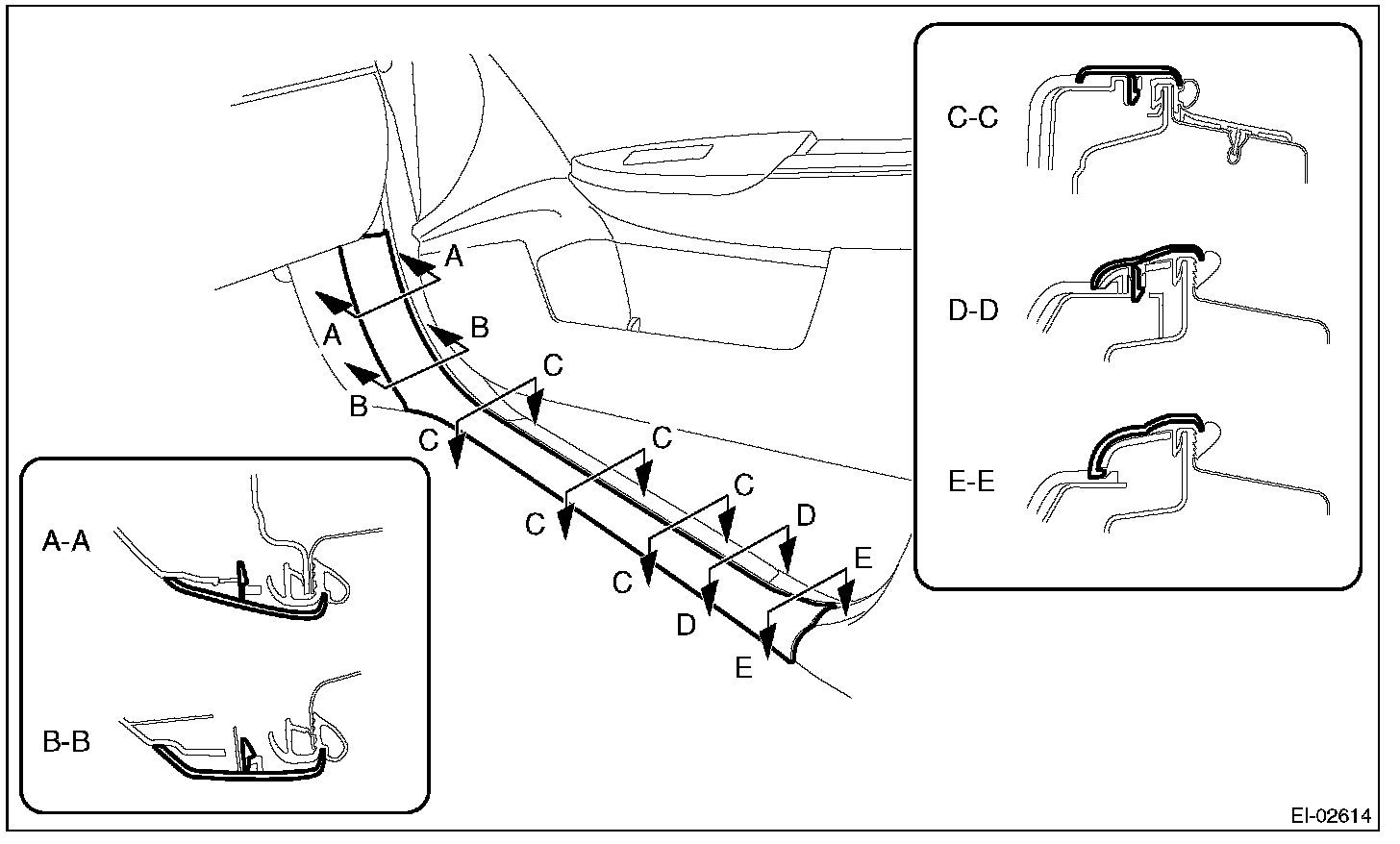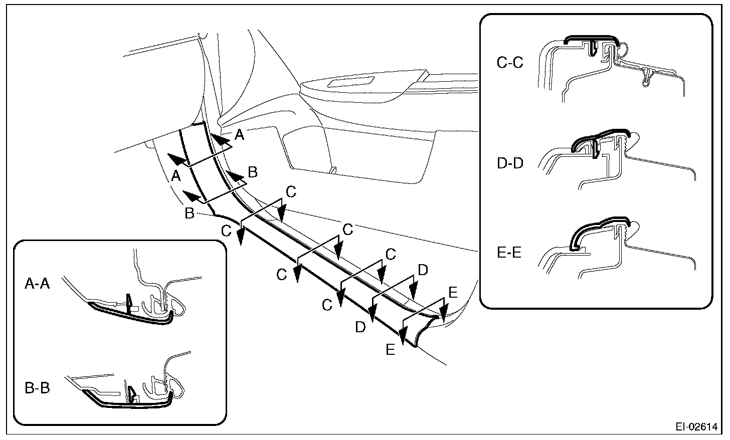 2. Turn over the floor mat and release the claw (C-C and D-D) by accessing from behind the side sill cover INN.