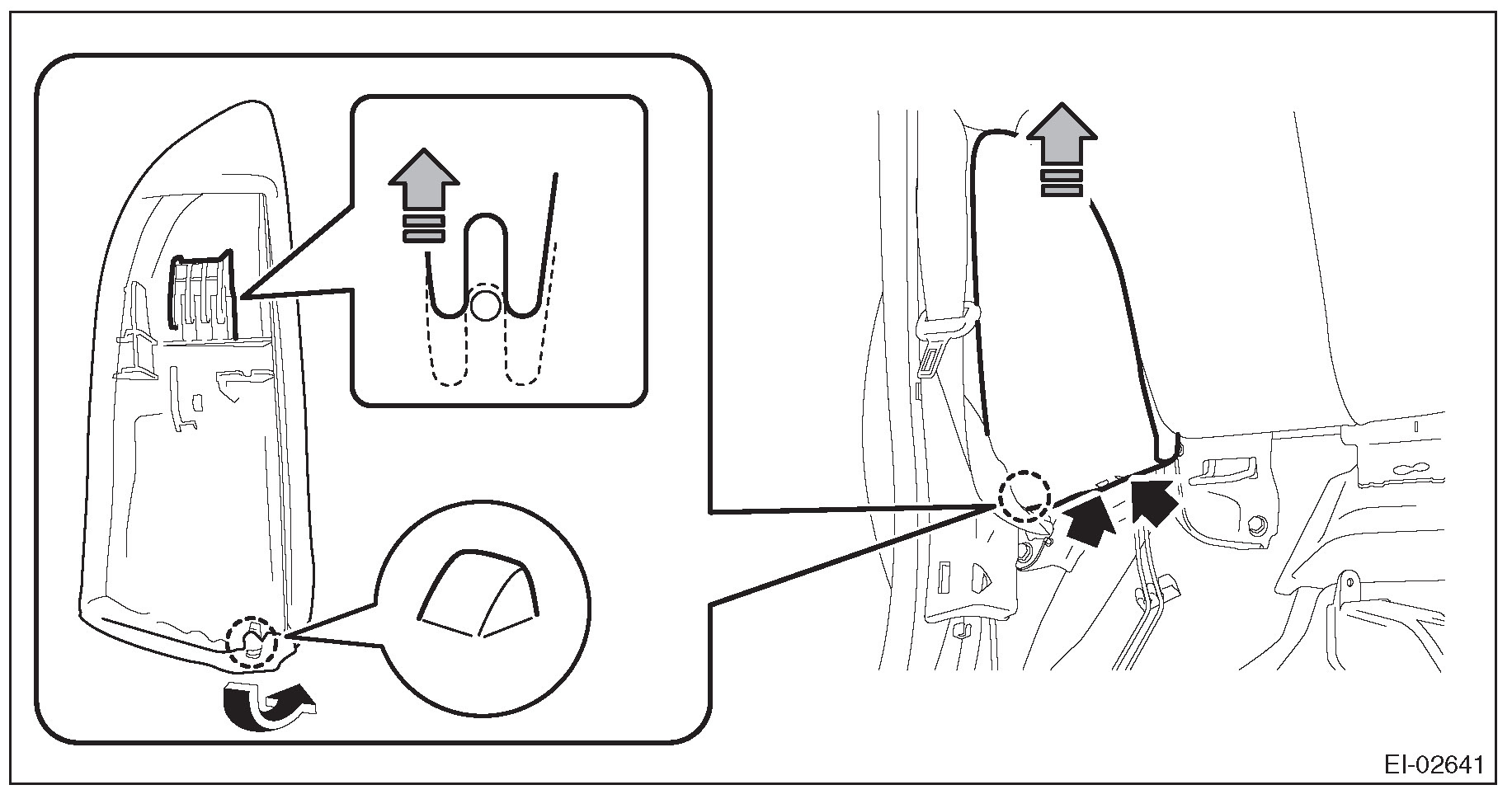 - Do not reuse the tether clips on the upper part of the front pillar trim. Always replace with a new part.