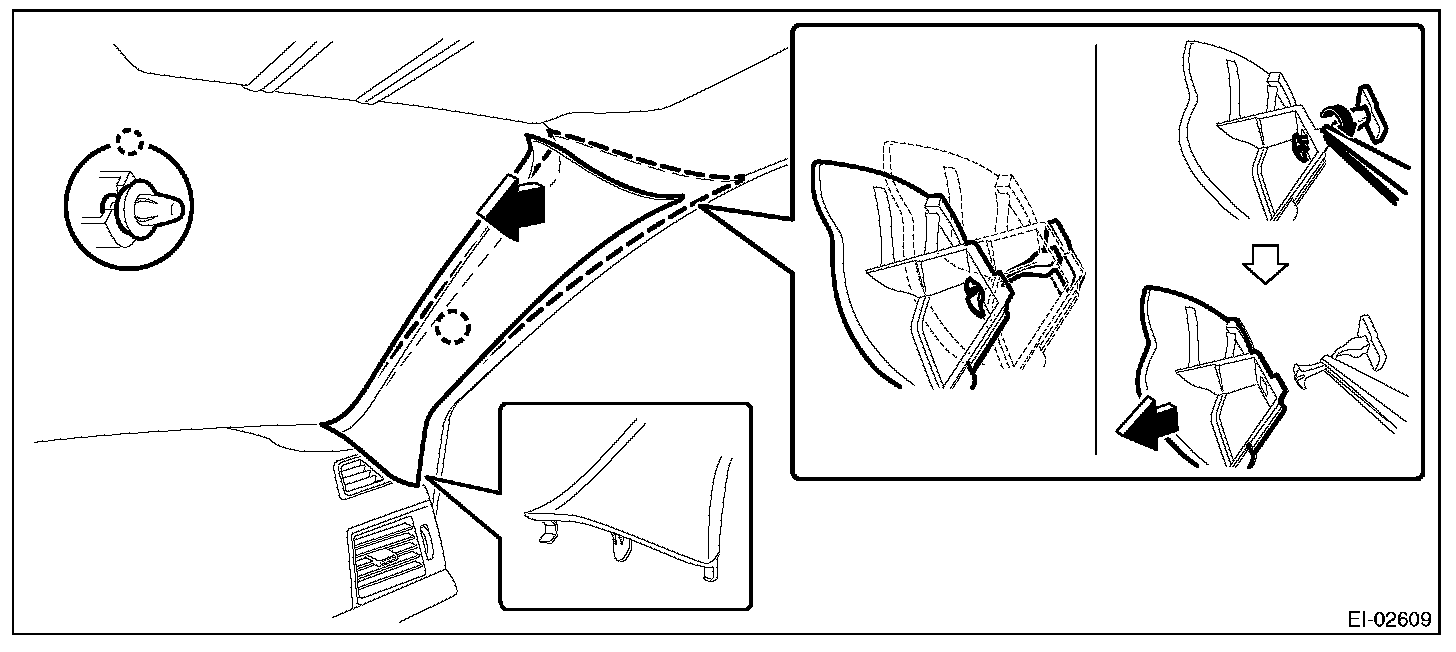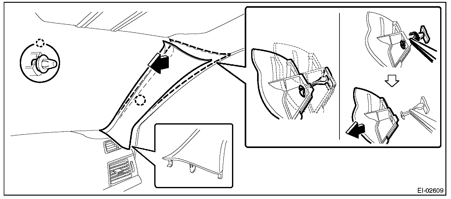 1. Pull the upper part of the front pillar trim towards the center of the vehicle.