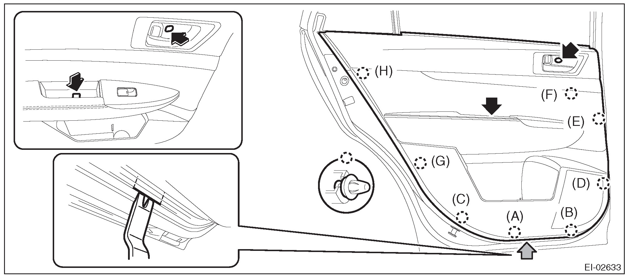 2. Remove the clips in the order of (A) to (H) and remove the door trim from the door panel.
