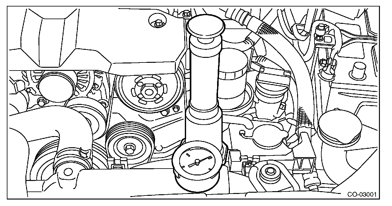 3) Remove the radiator cap, fill the radiator with engine coolant, and then install the radiator cap tester to the filler neck of radiator.