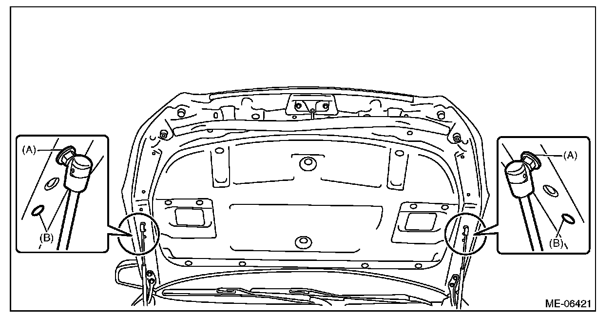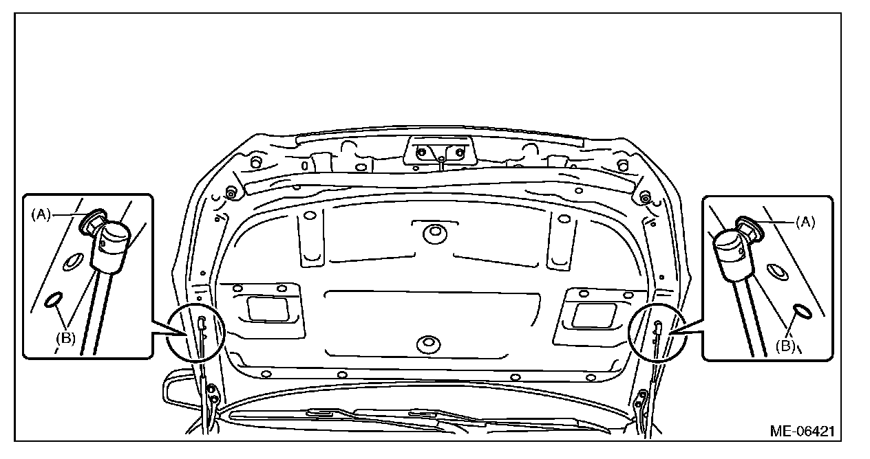 34) Change the front hood damper mounting position from (B) to (A), and close the front hood.