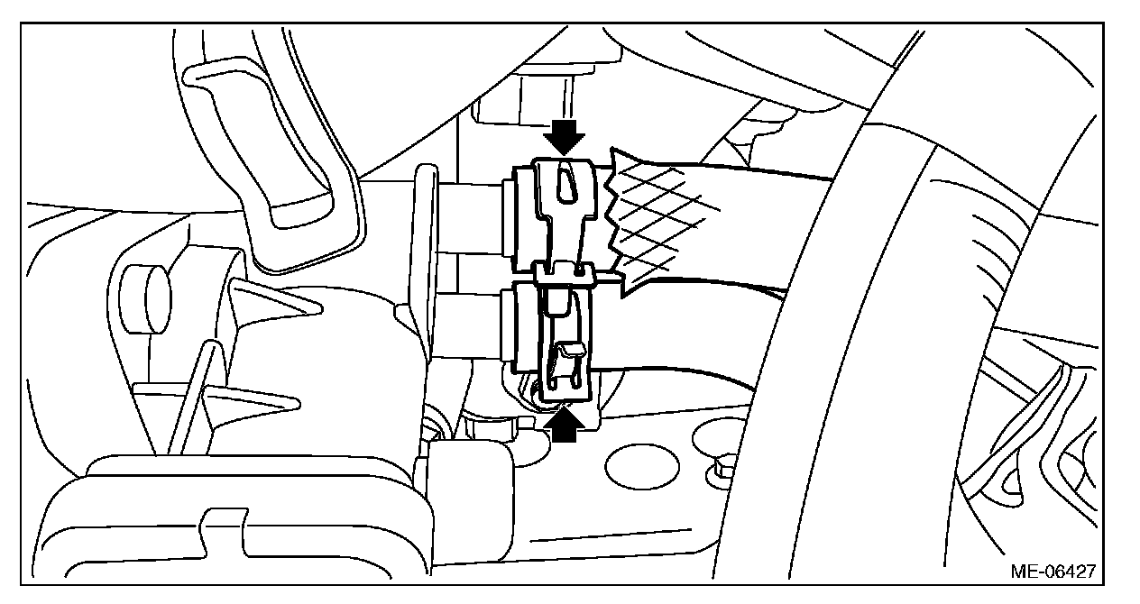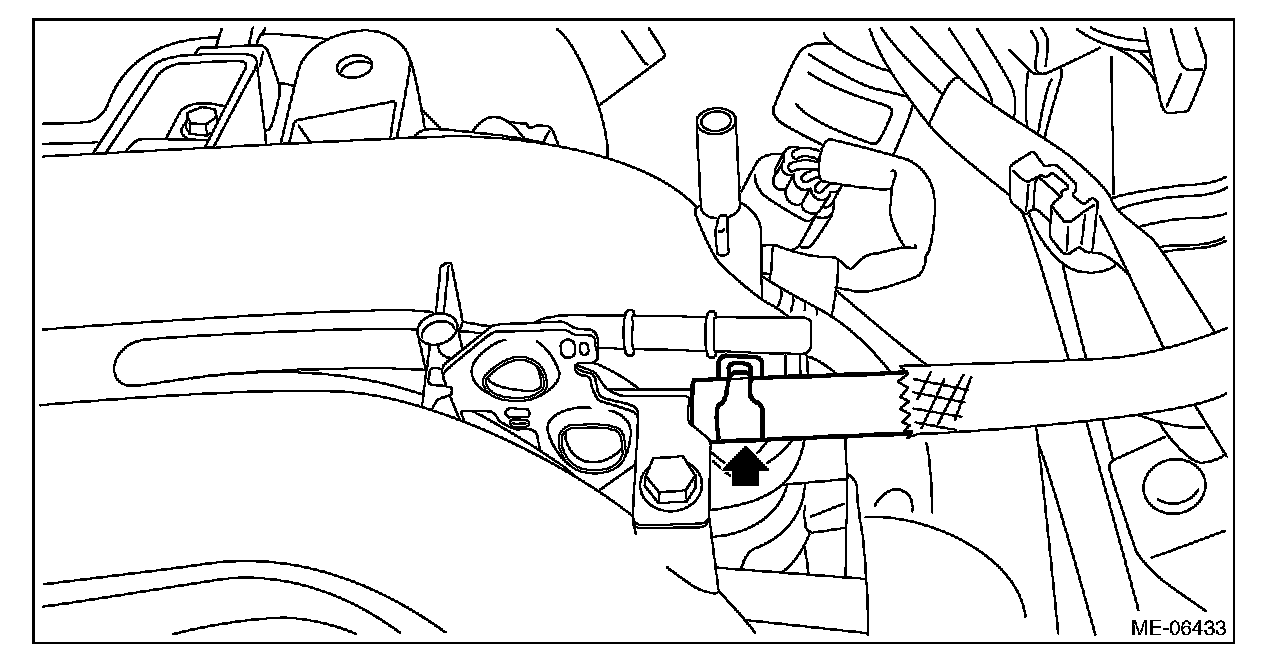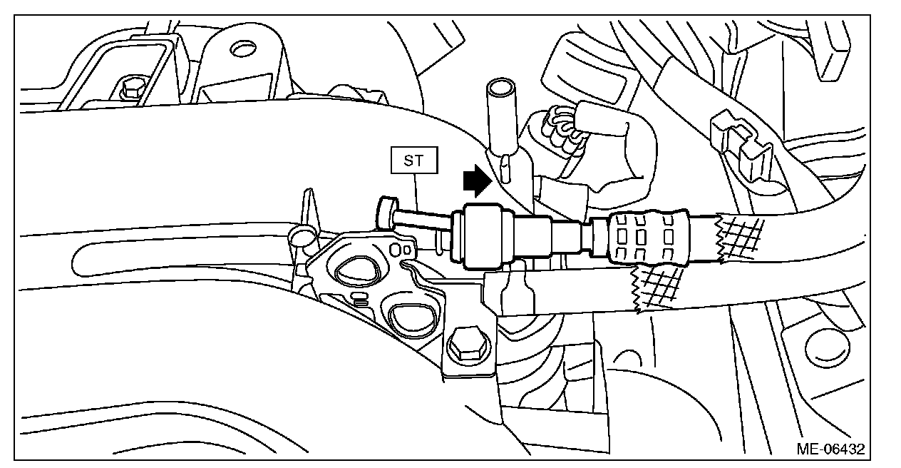 (1) Attach ST to the fuel delivery pipe and push ST in the direction of arrow mark to disconnect the quick connector of the fuel delivery hose.