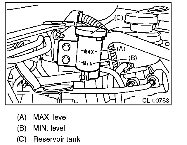 2) Check the clutch fluid level using the scale on the outside of the reservoir tank. If the clutch fluid level is below "MIN", fill the clutch fluid up to "MAX" level, and make sure that there is no leakage.